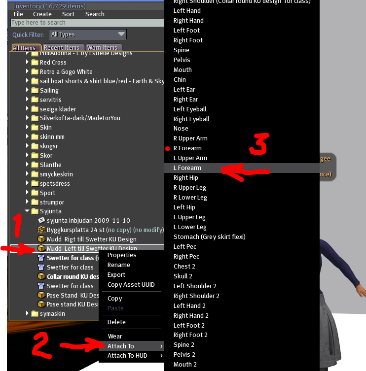 Nu är det dags att prova kjolen/kilten: Öppna ditt inventarium och leta reda på din nya kjol/kilt, högerklicka på den och välj: "Attach at".